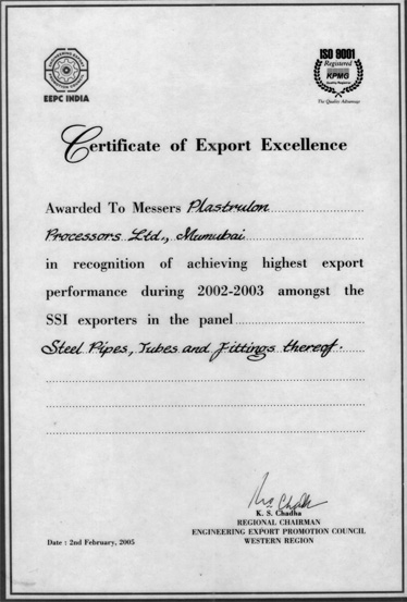 EXPORT EXCELLENCE CERTIFICATE